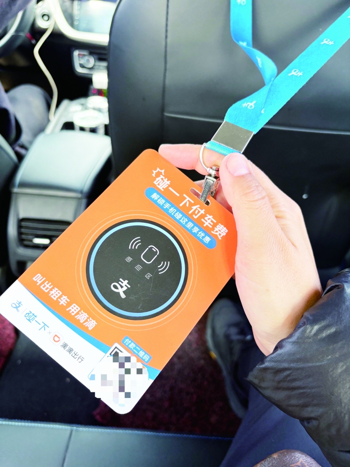 杭州一辆出租车上,当记者拿出手机准备扫码支付时,却被司机亮出一张印有“小蓝环”的卡片要求“碰一下”。“很方便,有优惠哦。”司机笑道。