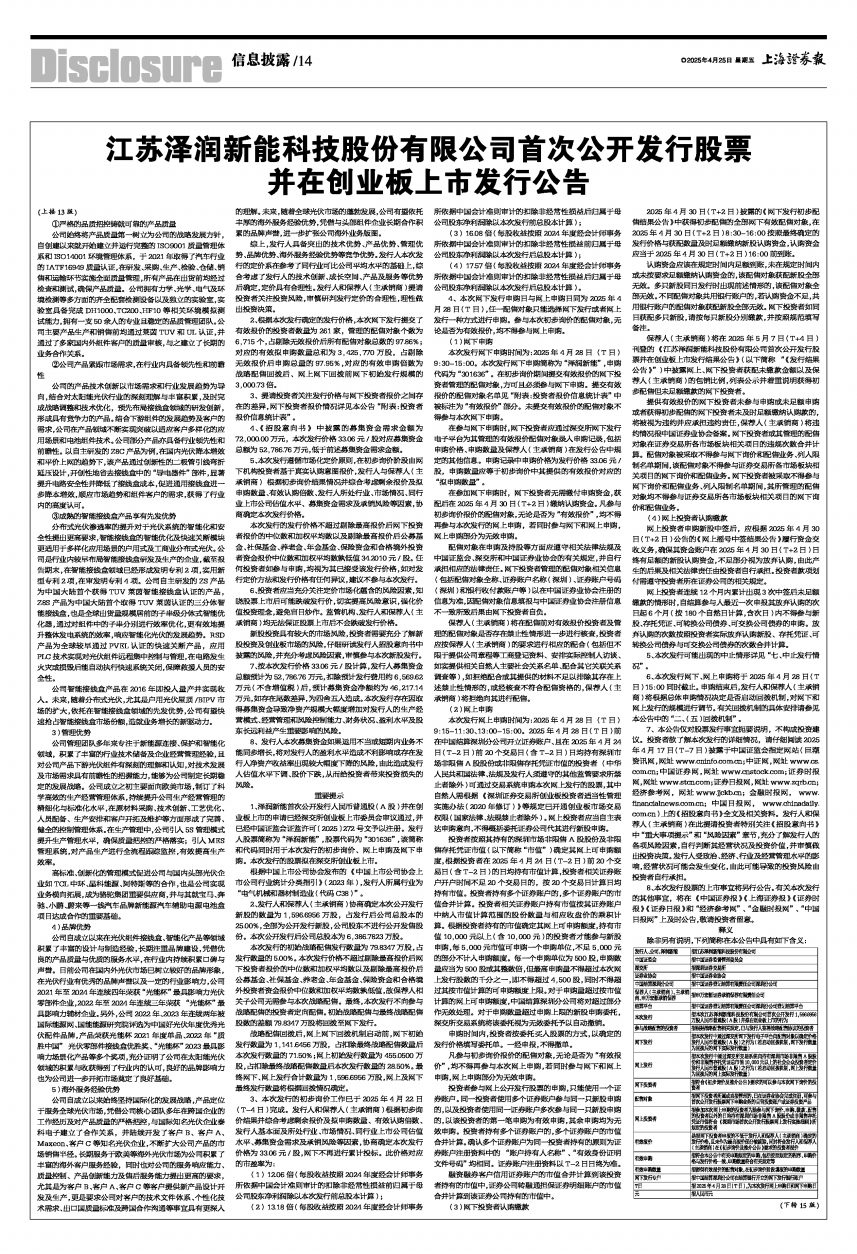 1、泽润新能首次公开发行人民币普通股(A股)并在创业板上市的申请已经深交所创业板上市委员会审议通过,并已经中国证监会证监许可〔2025〕272号文予以注册。发行人股票简称为“泽润新能”,股票代码为“301636”,该简称和代码同时用于本次发行的初步询价、网上申购及网下申购。本次发行的股票拟在深交所创业板上市。