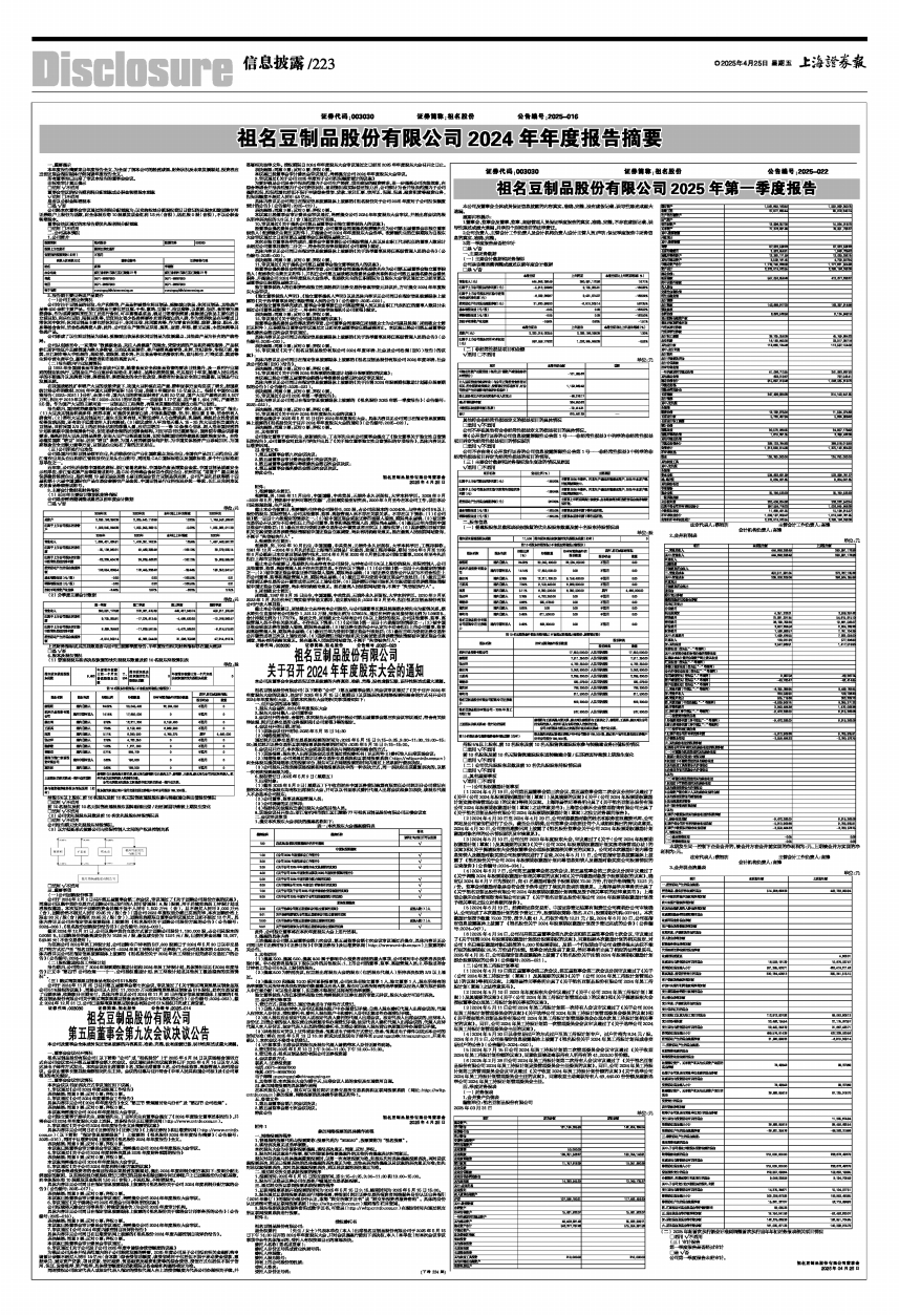 祖名豆制品股份有限公司(以下简称“公司”或“祖名股份”)于2025年4月24日以现场结合通讯方式在公司会议室召开第五届董事会第九次会议。会议通知及相关议案资料已于2025年4月14日以专人送达及电子邮件方式发出。本次会议应出席董事9名,实际出席董事9名,公司全体监事、高级管理人员列席会议。会议由董事长兼总经理蔡祖明先生主持。会议的召集与召开符合《中华人民共和国公司法》及《公司章程》的有关规定。