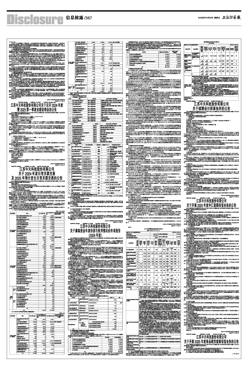 根据中国证券监督管理委员会(“中国证监会”)《上市公司监管指引第2号一一上市公司募集资金管理和使用的监管要求》《上海证券交易所上市公司自律监管指引第1号一一规范运作》等规定,现将江苏中天科技股份有限公司(“中天科技股份”或“公司”) 2019年公开发行可转换公司债券募集资金(“2019年期募集资金”)在2024年度的存放与使用情况分别进行说明。