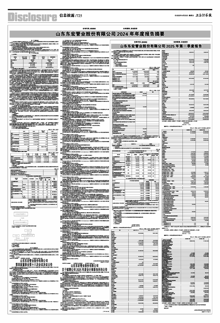 山东东宏管业股份有限公司(以下简称“公司”、“本公司”)第四届董事会第十八次会议通知于2025年4月13日以电子邮件或传真方式送达各位董事,会议于2025年4月23日以现场结合通讯会议方式召开。会议应出席董事9名,实际出席董事9名。会议由董事长倪立营先生召集并主持,公司监事及其他非董事的高级管理人员列席了本次会议。会议召开符合《公司法》及《公司章程》的规定。与会董事经过审议,以记名投票方式通过了如下决议:
