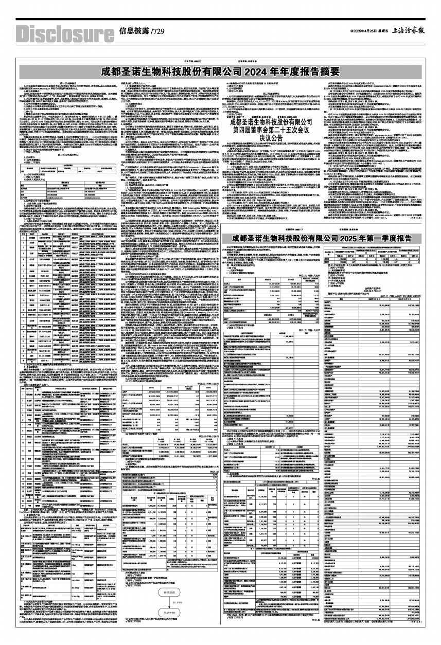 成都圣诺生物科技股份有限公司(以下简称“公司”)第四届董事会第二十五次会议通知于2025年4月14日以电话及邮件方式向各位董事发出,并于2025年4月24日在公司会议室以现场结合通讯方式召开。会议由公司董事长文永均先生召集和主持。本次会议应到董事9人,实到董事9人。本次会议的召集和召开程序符合有关法律、法规、规范性文件和《成都圣诺生物科技股份有限公司章程》(以下简称“《公司章程》”)的规定,会议决议合法、有效。