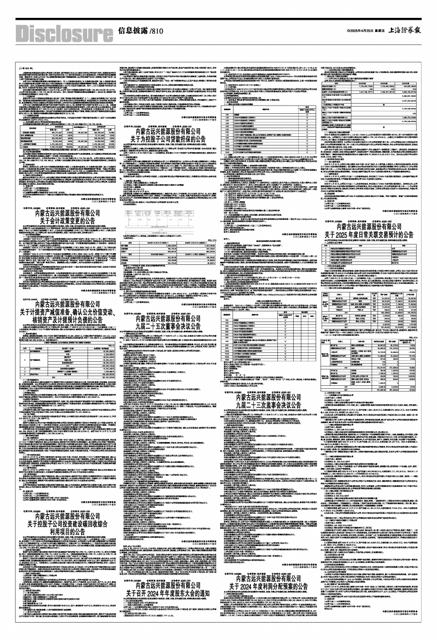 内蒙古远兴能源股份有限公司(以下简称公司、远兴能源)于2025年4月23日召开九届二十五次董事会、九届二十三次监事会,审议通过了《关于计提资产减值准备、确认公允价值变动、核销资产及计提预计负债的议案》,现将相关事项公告如下: