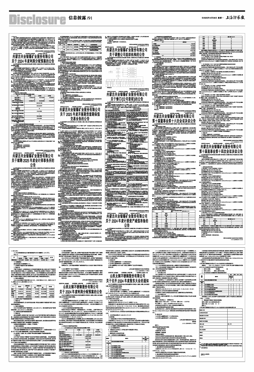 内蒙古兴业银锡矿业股份有限公司(以下简称“公司”)于2025年4月24日召开了第十届董事会第十六次会议及第十届监事会第十四次会议,审议通过了《2024年度利润分配预案》,该议案尚需提交公司2024年年度股东大会审议。