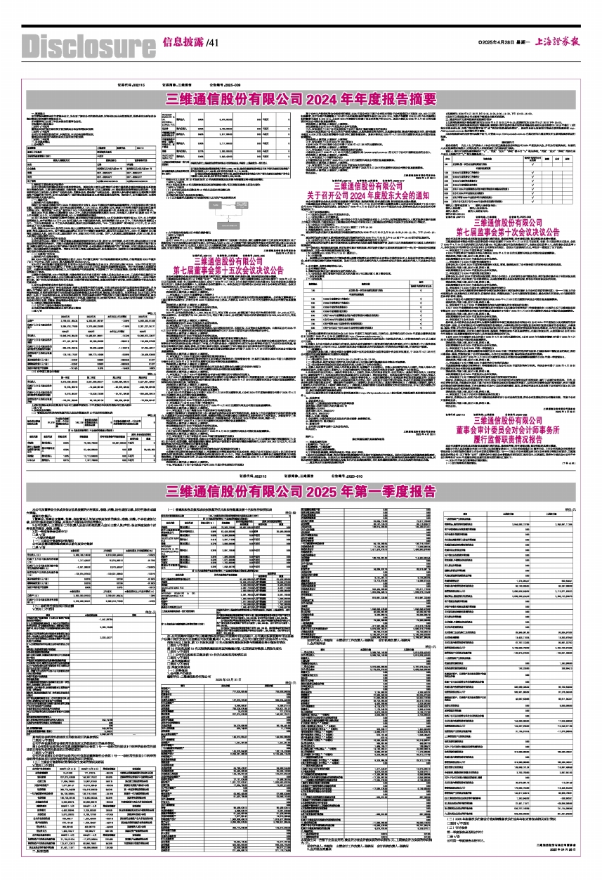 经审核,公司监事会及全体监事认为董事会编制和审核三维通信股份有限公司《公司2024年年度报告》及其摘要的程序符合法律、法规、公司章程和公司内部管理制度的各项规定;内容和格式符合中国证监会和深圳证券交易所的各项规定,内容真实、准确、完整,所包含的信息从各个方面真实地反映出公司2024年度的经营管理和财务状况等事项,不存在任何虚假记载、误导性陈述和重大遗漏报,并对其内容的真实性、准确性、完整性承担个别及连带责任;在提出本意见前,未发现参与《公司2024年年度报告》及其摘要编制和审议的人员有违反保密规定的行为。