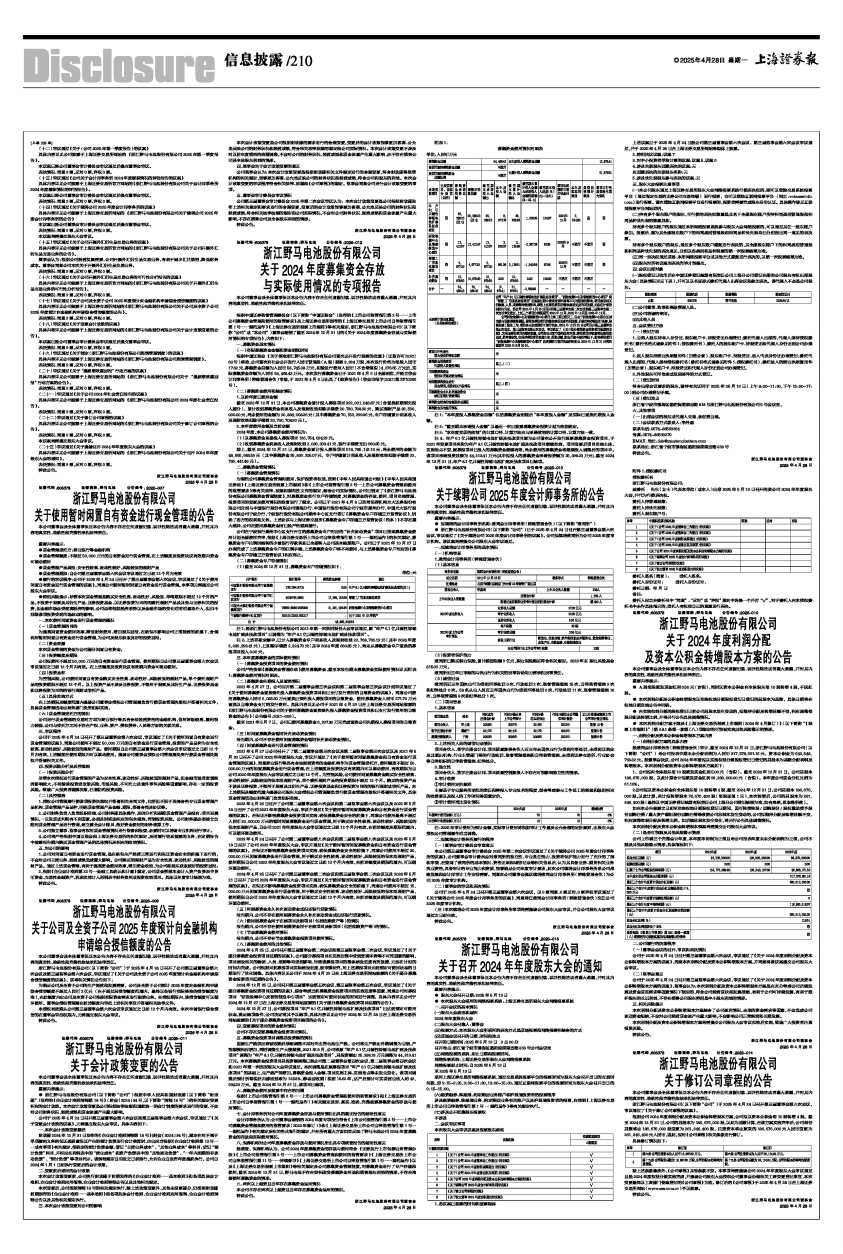 根据中国证券监督管理委员会(以下简称“中国证监会”)发布的《上市公司监管指引第2号一一上市公司募集资金管理和使用的监管要求》及上海证券交易所颁布的《上海证券交易所上市公司自律监管指引第1号一一规范运作》《上海证券交易所股票上市规则》等有关规定,浙江野马电池股份有限公司(以下简称“公司”或“本公司”)董事会编制了截至2024年12月31日的《关于2024年度募集资金存放与实际使用情况的专项报告》,内容如下: