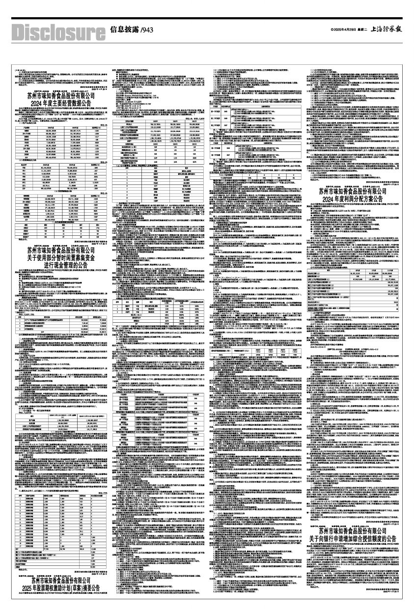 根据《上海证券交易所上市公司自律监管指引第3号行业信息披露:第十四号一食品制造》的相关规定,现将苏州市味知香食品股份有限公司(以下简称“公司”或“味知香”) 2024年度主要经营数据公告披露如下: