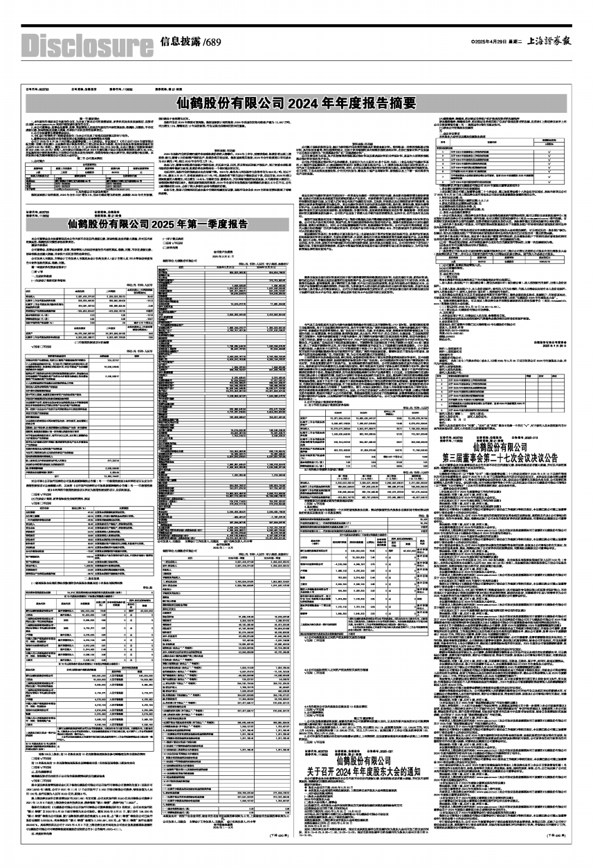 内容详见上海证券交易所网站(www.sse.com.cn)及公司法定信息披露媒体同日披露的《仙鹤股份有限公司2024年年度报告》及《仙鹤股份有限公司2024年年度报告摘要》。