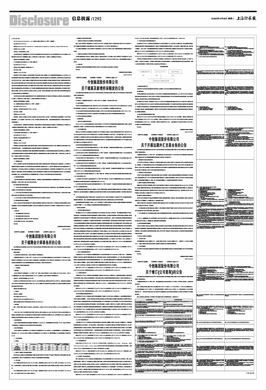 今创集团股份有限公司(以下简称“公司”)于2025年4月28日召开的第五届董事会第九次会议审议通过了《关于续聘上会会计师事务所(特殊普通合伙)为公司2025年度审计机构的议案》,决定继续聘请上会会计师事务所(特殊普通合伙)为公司2025年度财务报告和内部控制的审计机构,该事项尚需提交股东大会审议批准。现将有关事项公告如下: