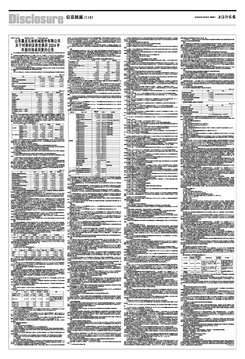 山东墨龙石油机械股份有限公司(以下简称“公司”或“山东墨龙”)于2025年4月8日收到深圳证券交易所上市公司管理一部下发的公司年报问询函〔2025〕第17号《关于对山东墨龙石油机械股份有限公司2024年年报的问询函》(以下简称“《问询函》”),根据《问询函》要求,公司对相关问题回复如下: