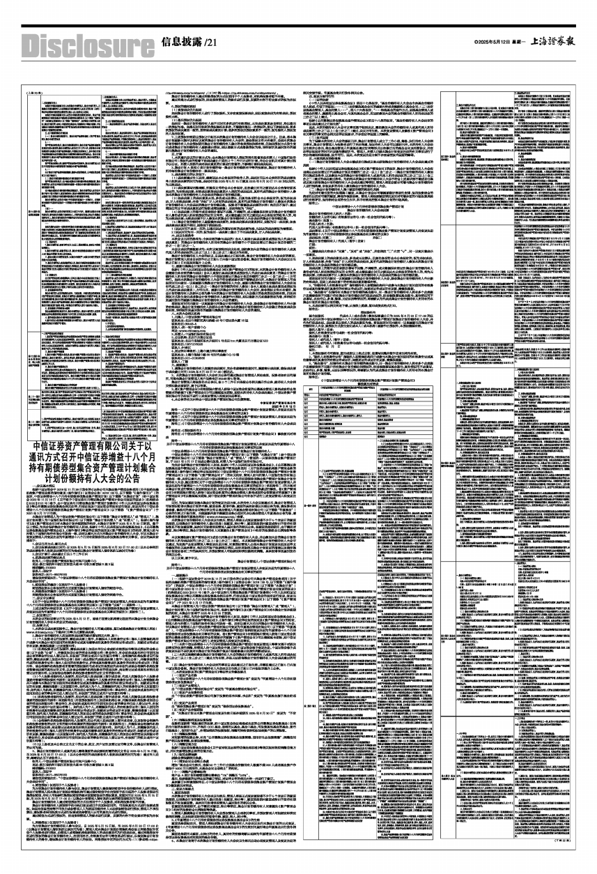 本集合计划管理人为中信证券资产管理有限公司(以下简称“集合计划管理人”或“管理人”),集合计划托管人为中国银行股份有限公司(以下简称“集合计划托管人”或“托管人”)。根据《操作指引》及《资产管理合同》对本集合计划存续期限的约定,本集合计划将于2025年6月30日到期。鉴于以上情况,为充分保护集合计划份额持有人利益,根据《中华人民共和国证券投资基金法》、《公开募集证券投资基金运作管理办法》、《操作指引》等法律法规的规定及《资产管理合同》的约定,管理人经与托管人中国银行股份有限公司协商一致,决定以通讯方式召开集合计划份额持有人大会,审议本集合计划变更管理人并变更注册为华夏增益十八个月持有期债券型证券投资基金等有关事项,会议的具体安排如下: