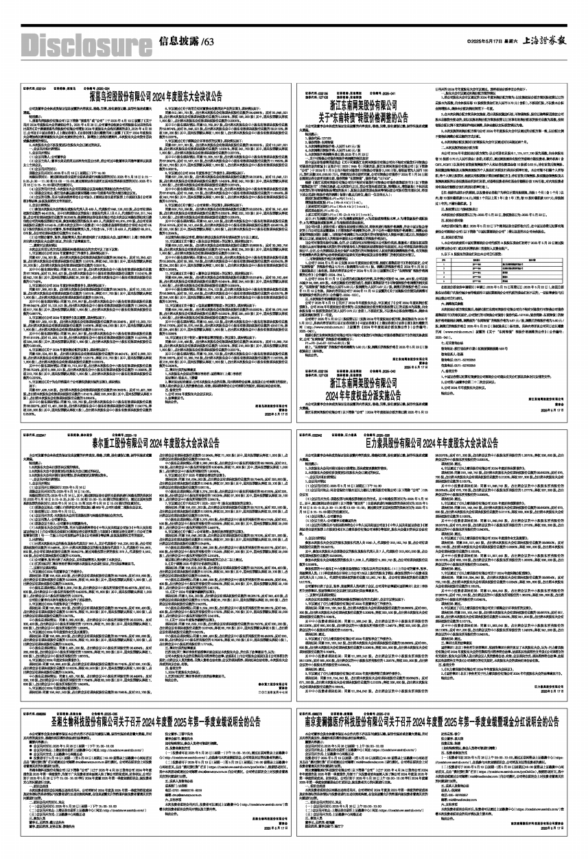 浙江东南网架股份有限公司(以下简称“公司”)2024年年度权益分派方案已获2025年5月13日召开的2024年年度股东大会审议通过。现将权益分派事宜公告如下: