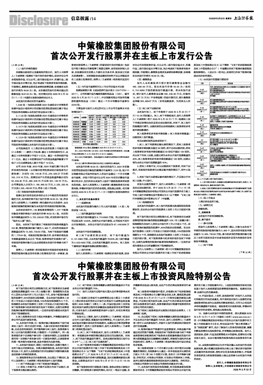 19、拟参与本次发行申购的投资者,须认真阅读2025年5月15日(T-6日)刊登在上交所(www.sse.com.cn)的《中策橡胶集团股份有限公司首次公开发行股票并在主板上市招股意向书》全文,特别是其中的“重大事项提示”及“风险因素”章节,充分了解发行人的各项风险因素,谨慎判断其经营状况及投资价值,并审慎做出投资决策。发行人受到政治、经济、行业及经营管理水平的影响,经营状况可能会发生变化,由此可能导致的投资风险应由投资者自行承担。