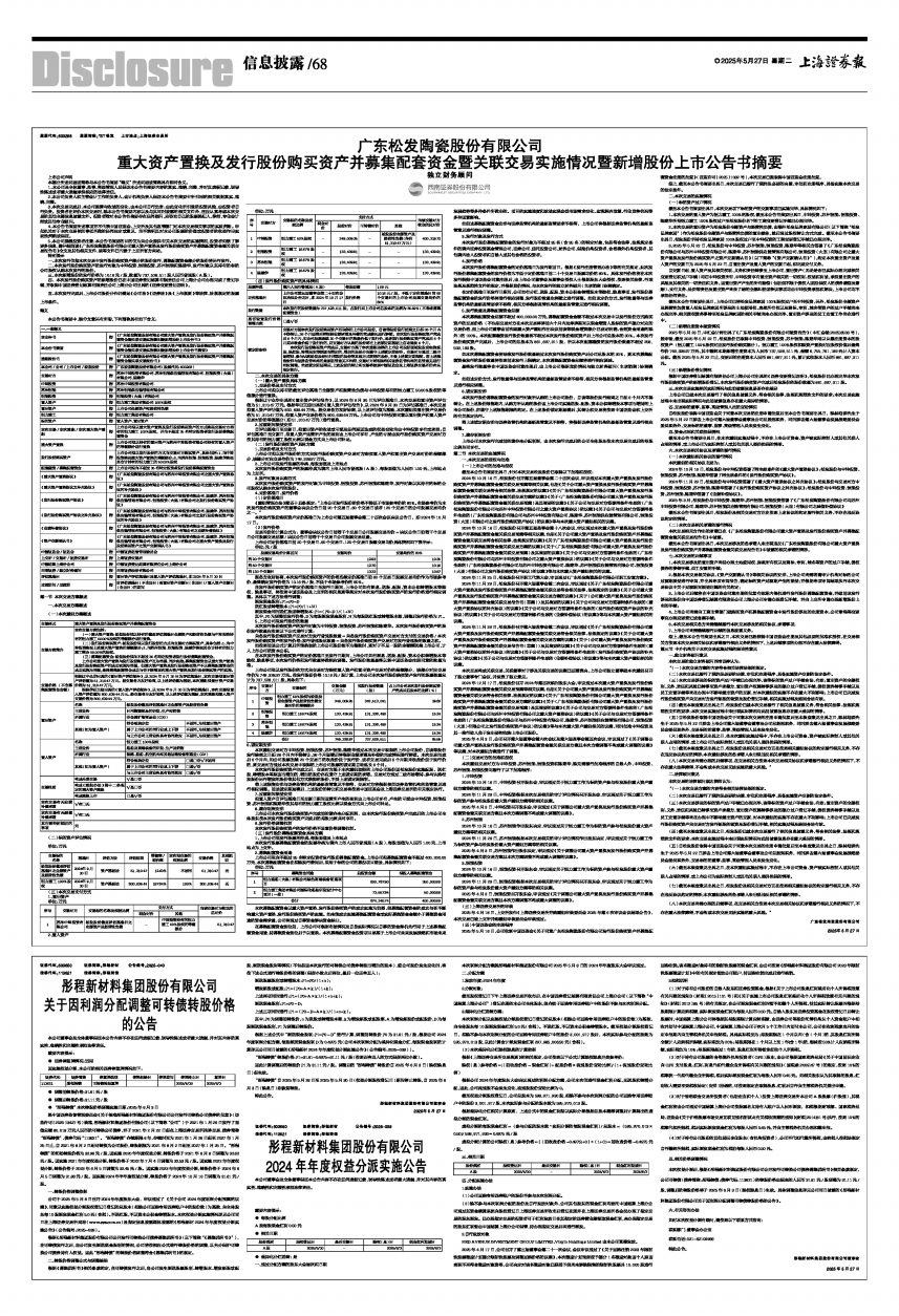 5、本公司提醒投资者注意:本公告书摘要的目的仅为向公众提供有关本次交易的实施情况,投资者如欲了解更多信息,请仔细阅读《广东松发陶瓷股份有限公司重大资产置换及发行股份购买资产并募集配套资金暨关联交易报告书》全文及其他相关文件,该等文件已刊载于上交所官方网站。