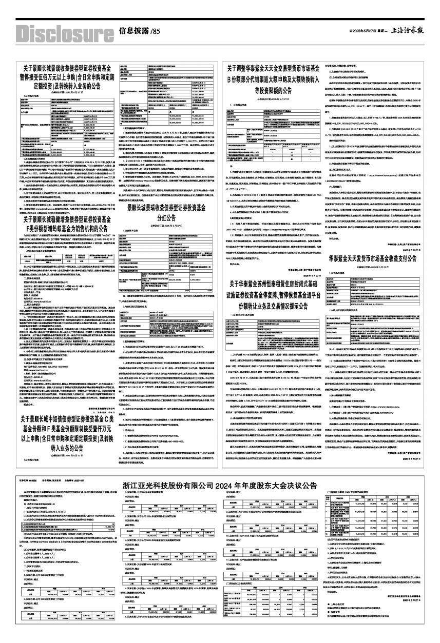1、景顺长城基金管理有限公司(以下简称“本公司”)现决定自2025年5月27日起,投资人通过所有销售机构和本公司直销中心申购(含日常申购和定期定额投资,下同)或转换转入本基金,做以下申请金额暂停业务调整:单日每个基金账户累计的申请金额在本基金任意一类基金份额上应小于或等于500万元,如单日单个基金账户在本基金任意一类基金份额上的累计申请金额超过500万元的,本公司将根据单笔申请金额由高至低进行排序并确认,对于单笔导致累计金额大于500万元的申请,本公司将对该笔申请金额全部确认为失败,并按此原则继续确认,直至累计金额达到前述要求。