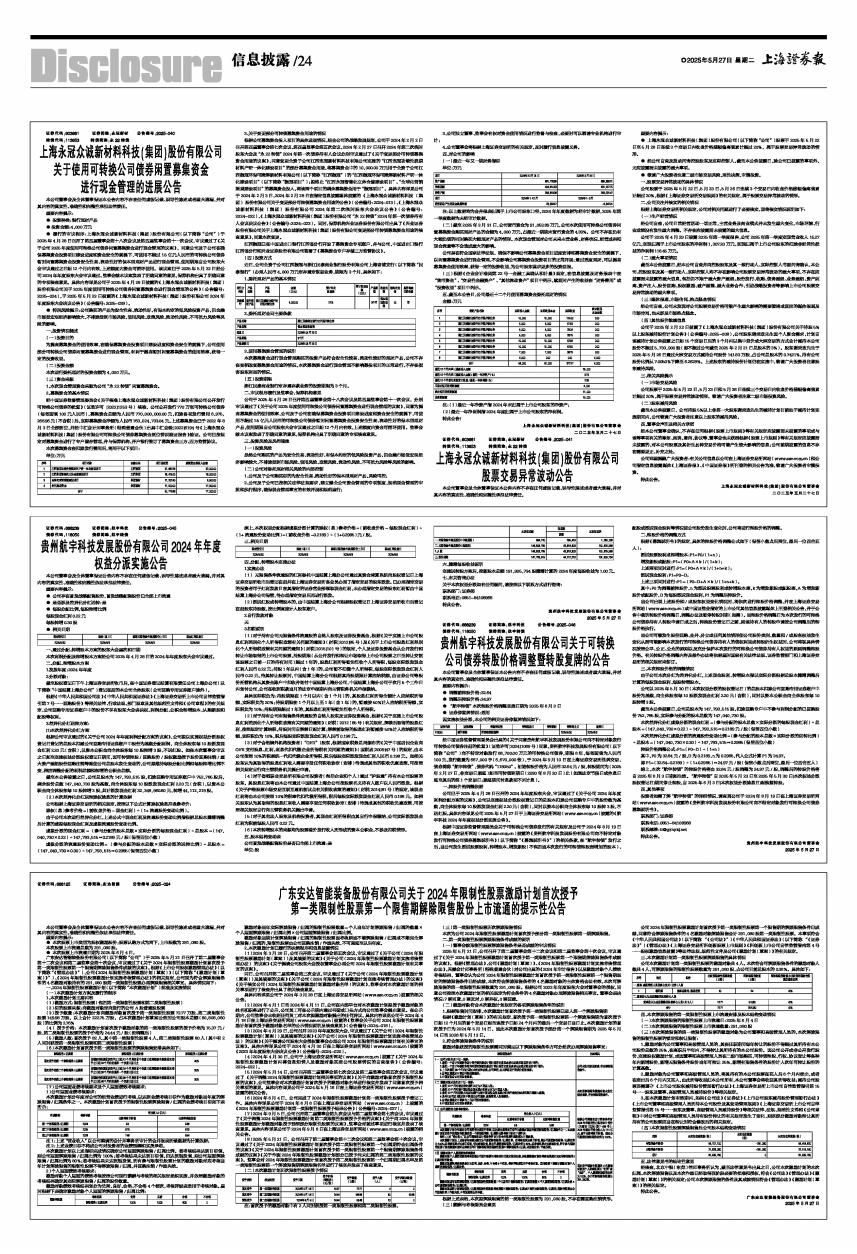 综上,本次“航宇转债”的转股价格将由32.64元/股调整为24.97元/股,调整后的转股价格将自2025年6月3日期起生效。“航宇转债”自2025年5月23日至2025年5月30日(本次权益分派股权登记日)期间停止转股,自2025年6月3日(本次权益分派除息日)起恢复转股。