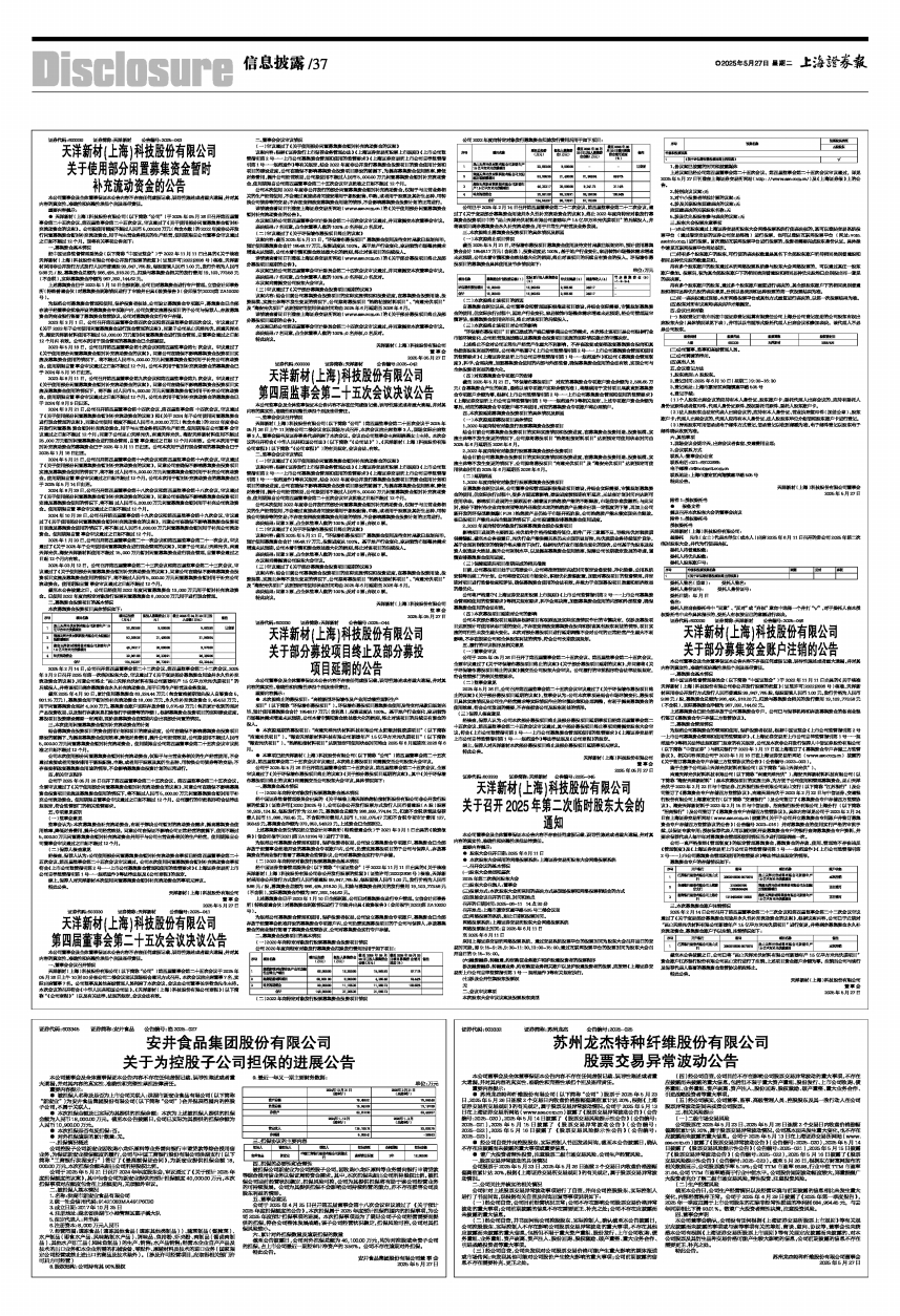 ● 天洋新材(上海)科技股份有限公司(以下简称“公司”)于2025年05月26日召开第四届董事会第二十五次会议、第四届监事会第二十五次会议,审议通过了《关于使用部分闲置募集资金暂时补充流动资金的议案》。公司拟使用额度不超过人民币5,000.00万元(包含本数)的2022年度非公开发行闲置募集资金暂时补充流动资金,用于与主营业务相关的生产经营,使用期限自公司董事会审议通过之日起不超过12个月。现将有关事项公告如下: