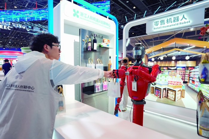 浙江人形机器人创新中心工作人员在第四届中国-中东欧国家博览会暨国际消费品博览会“数智中东欧”展区展示一款零售机器人(2025年5月22日摄)。新华社图