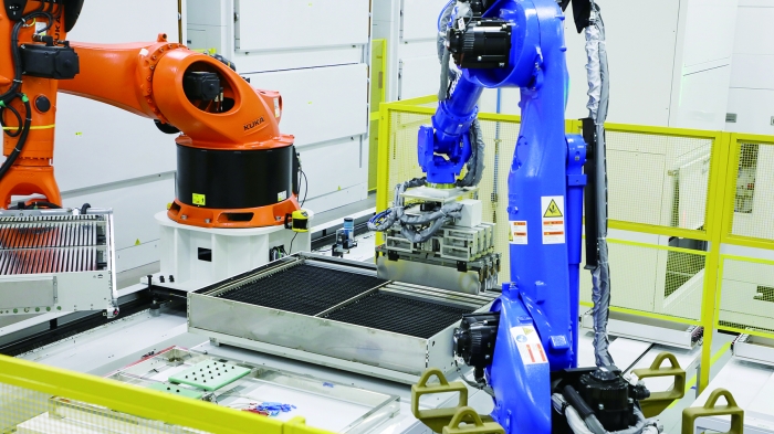 走进蜂巢能源金坛自动化工厂,高速叠片机以超高效率生产极片,极片边缘负责导电的极耳部分薄至3微米左右,相当于头发丝的二十分之一。