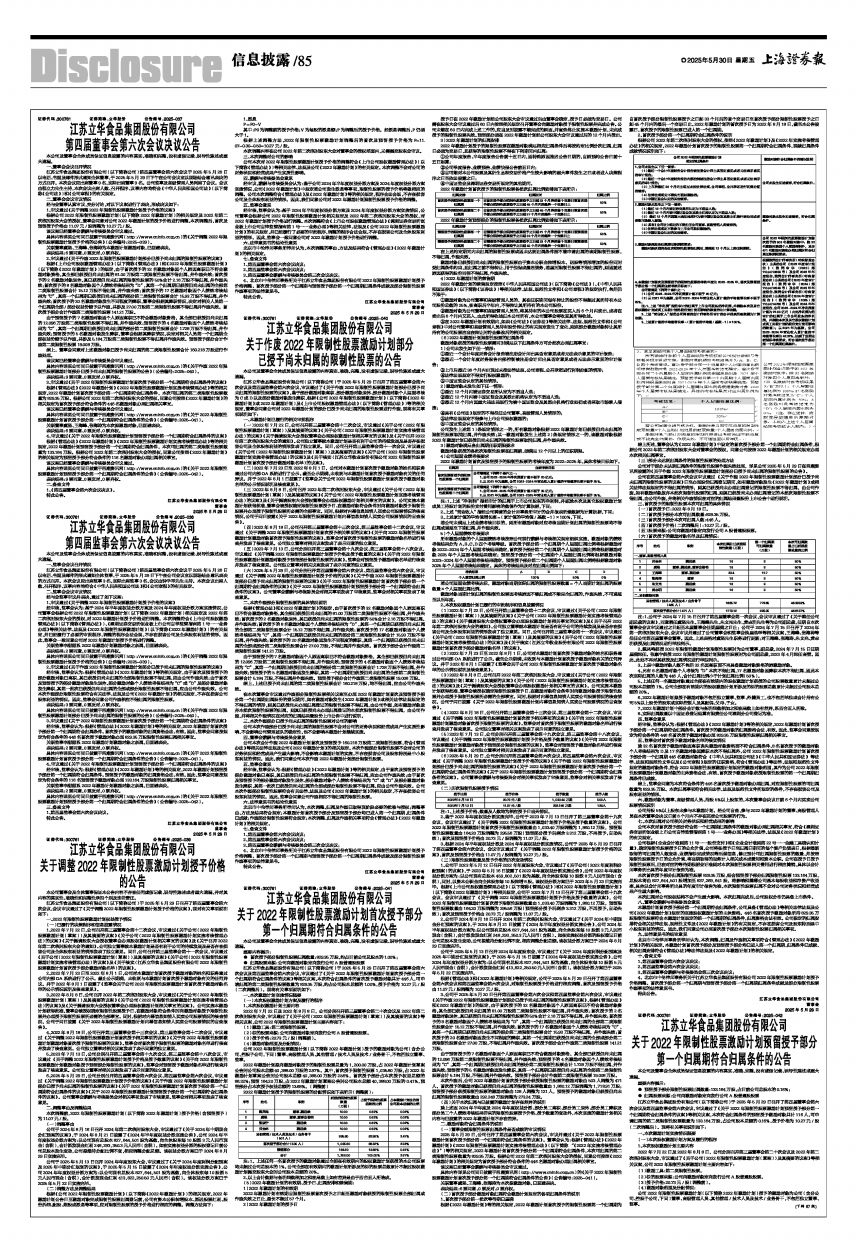 江苏立华食品集团股份有限公司(以下简称公司)于2025年5月29日召开了第四届董事会第六次会议,会议审议通过了《关于调整2022年限制性股票激励计划授予价格的议案》,现对有关事项说明如下: