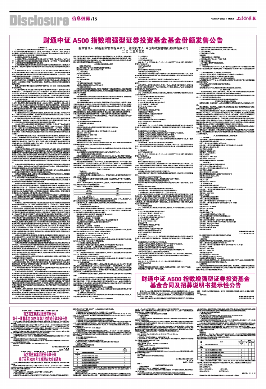 10、本公告仅对本基金募集的有关事项和规定予以说明。投资人欲了解本基金的详细情况,请详细阅读2025年5月30日发布本公司网站(www.ctfund.com)等指定网站上的《财通中证A500指数增强型证券投资基金招募说明书》(以下简称“招募说明书”)等文件,投资者亦可通过本公司网站下载基金业务申请表格并了解本基金份额发售的相关事宜。本基金的基金合同及招募说明书提示性公告和本公告将同时刊登在《上海证券报》。