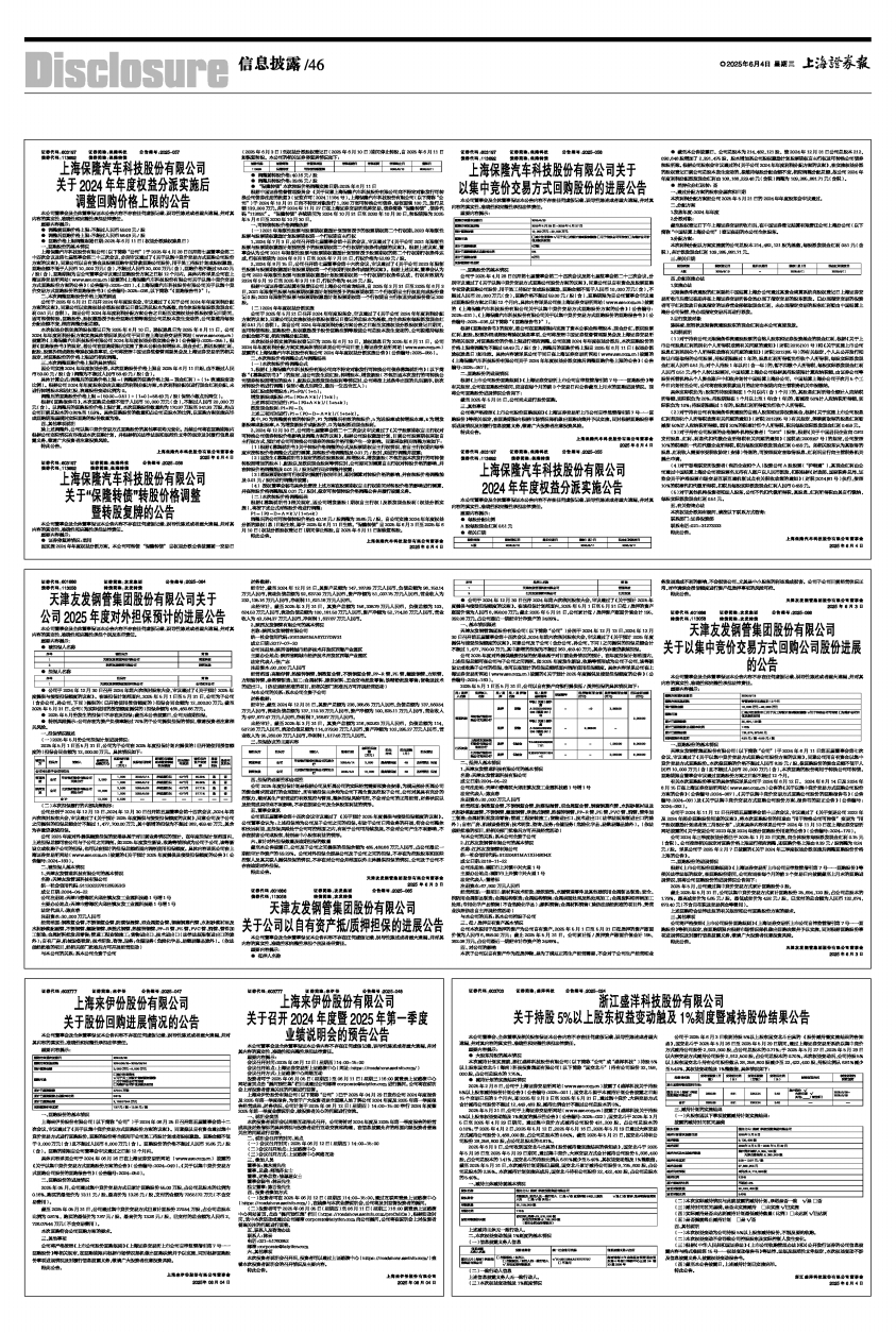 根据《回购报告书》的规定,若公司在回购期限内实施了资本公积金转增股本、现金分红、派送股票红利、配股、股票拆细或缩股等除权除息事项,公司将按照中国证券监督管理委员会及上海证券交易所的相关规定,对回购股份的价格上限进行相应调整。公司实施2024年年度权益分派后,本次回购股份的价格上限将调整为不超过58.49元/股(含),调整后的回购价格上限自2025年6月11日(权益分派除权除息日)起生效。具体内容请详见公司于同日在上海证券交易所网站(www.sse.com.cn)披露的《上海保隆汽车科技股份有限公司关于2024年年度权益分派实施后调整回购价格上限的公告》(公告编号:2025-057)。