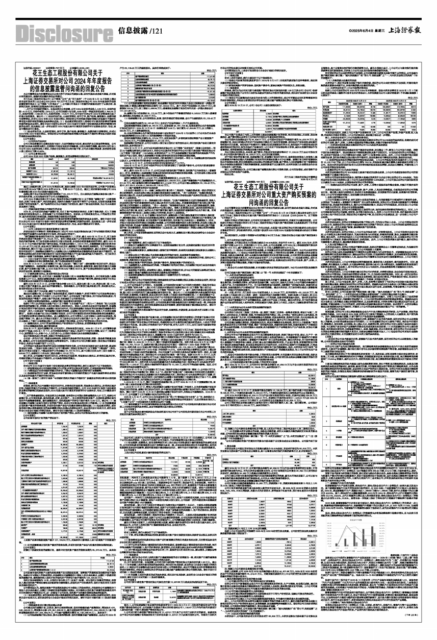 花王生态工程股份有限公司(以下简称“公司”或“花王股份”)于2025年5月14日收到上海证券交易所发来的上证公函【2025】0555号《关于花王生态工程股份有限公司2024年年度报告的信息披露监管问询函》(以下简称“《问询函》”),公司就《问询函》中所提的问题逐项进行了认真分析,根据相关规定,现将相关回复具体内容公告如下: