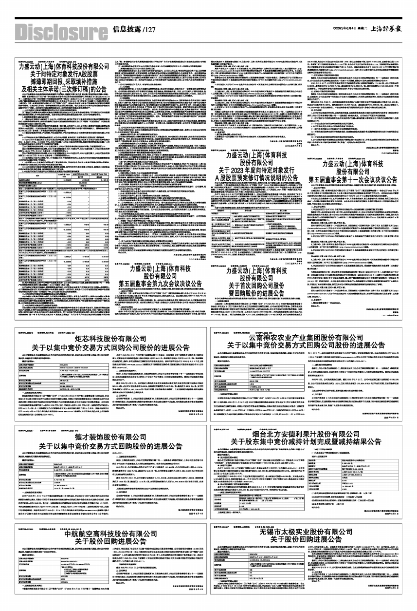 《力盛云动(上海)体育科技股份有限公司2023年度向特定对象发行A股股票预案(四次修订稿)》及相关文件已于2025年6月4日在《中国证券报》《上海证券报》《证券时报》《证券日报》及巨潮资讯网(http://www.cninfo.com.cn)上披露,敬请投资者注意查阅。