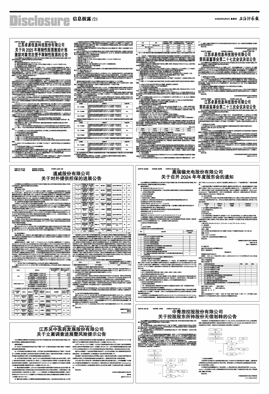 3、2025年5月27日,公司召开2025年第一次临时股东大会,审议通过了《关于〈江苏卓易信息科技股份有限公司2025年限制性股票激励计划(草案)〉及其摘要的议案》《关于〈江苏卓易信息科技股份有限公司2025年限制性股票激励计划实施考核管理办法〉的议案》以及《关于提请股东大会授权董事会办理公司股权激励计划相关事宜的议案》。同日,公司于上海证券交易所网站(www.sse.com.cn)披露了《江苏卓易信息科技股份有限公司关于公司2025年限制性股票激励计划内幕信息知情人买卖公司股票情况的自查报告》(公告编号:2025-022)。