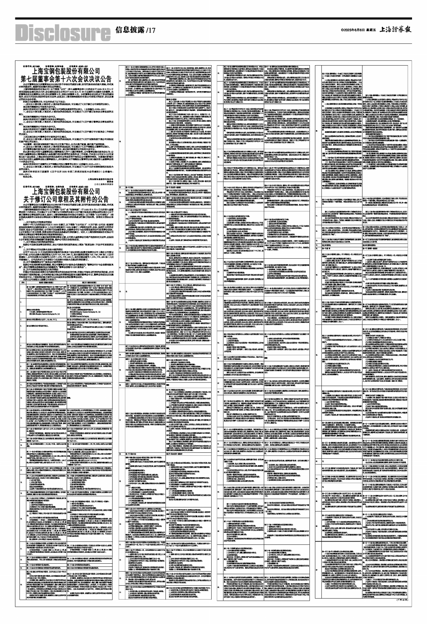 上海宝钢包装股份有限公司(以下简称“公司”或“宝钢包装”)于2025年6月5日召开第七届董事会第十六次会议,审议通过了《关于修订公司章程的议案》《关于修订股东会议事规则的议案》《关于修订董事会议事规则的议案》,拟对《上海宝钢包装股份有限公司章程》(以下简称“《公司章程》”)部分条款及其附件《股东会议事规则》《董事会议事规则》相应条款进行修订和完善。现将有关情况公告如下: