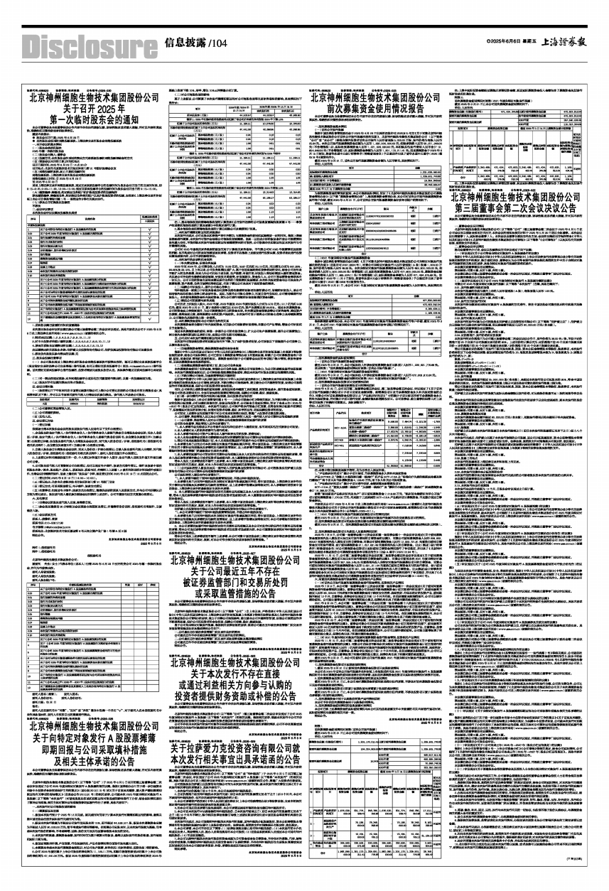 根据《上市公司证券发行注册管理办法》《监管规则适用指引一一发行类第7号》等相关规定,公司就前次募集资金的使用情况编制了《北京神州细胞生物技术集团股份公司前次募集资金使用情况报告》,信永中和会计师事务所(特殊普通合伙)对前述报告进行审核并出具了XYZH/2025BJAA1B0645号《北京神州细胞生物技术集团股份公司截至2025年3月31日止前次募集资金使用情况报告及鉴证报告》。具体内容详见公司在上海证券交易所网站(www.sse.com.cn)披露的相关公告。
