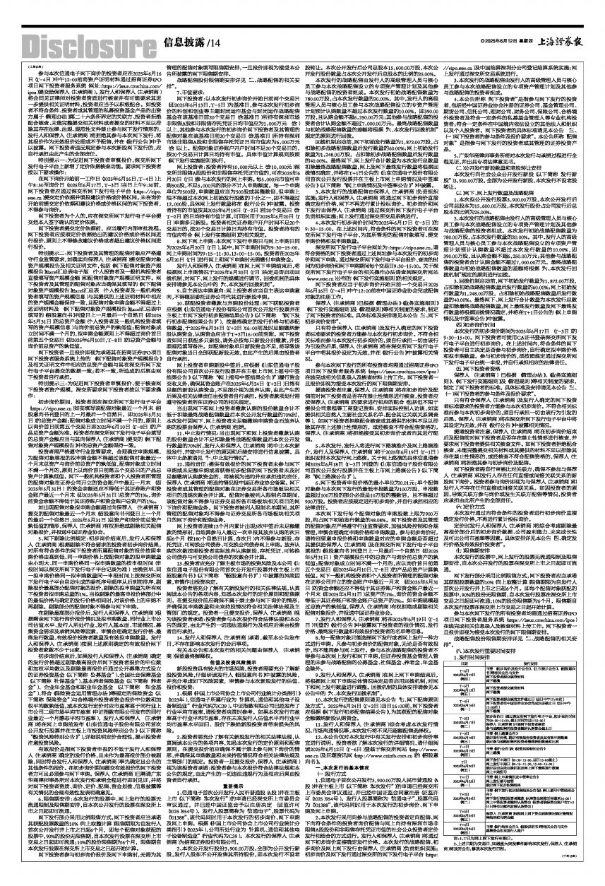 7、发行人和保荐人(主承销商)将在2025年6月19日(T-1日)刊登的《发行公告》中披露网下投资者的报价情况、发行价格、最终发行数量和有效报价投资者的名单等信息。