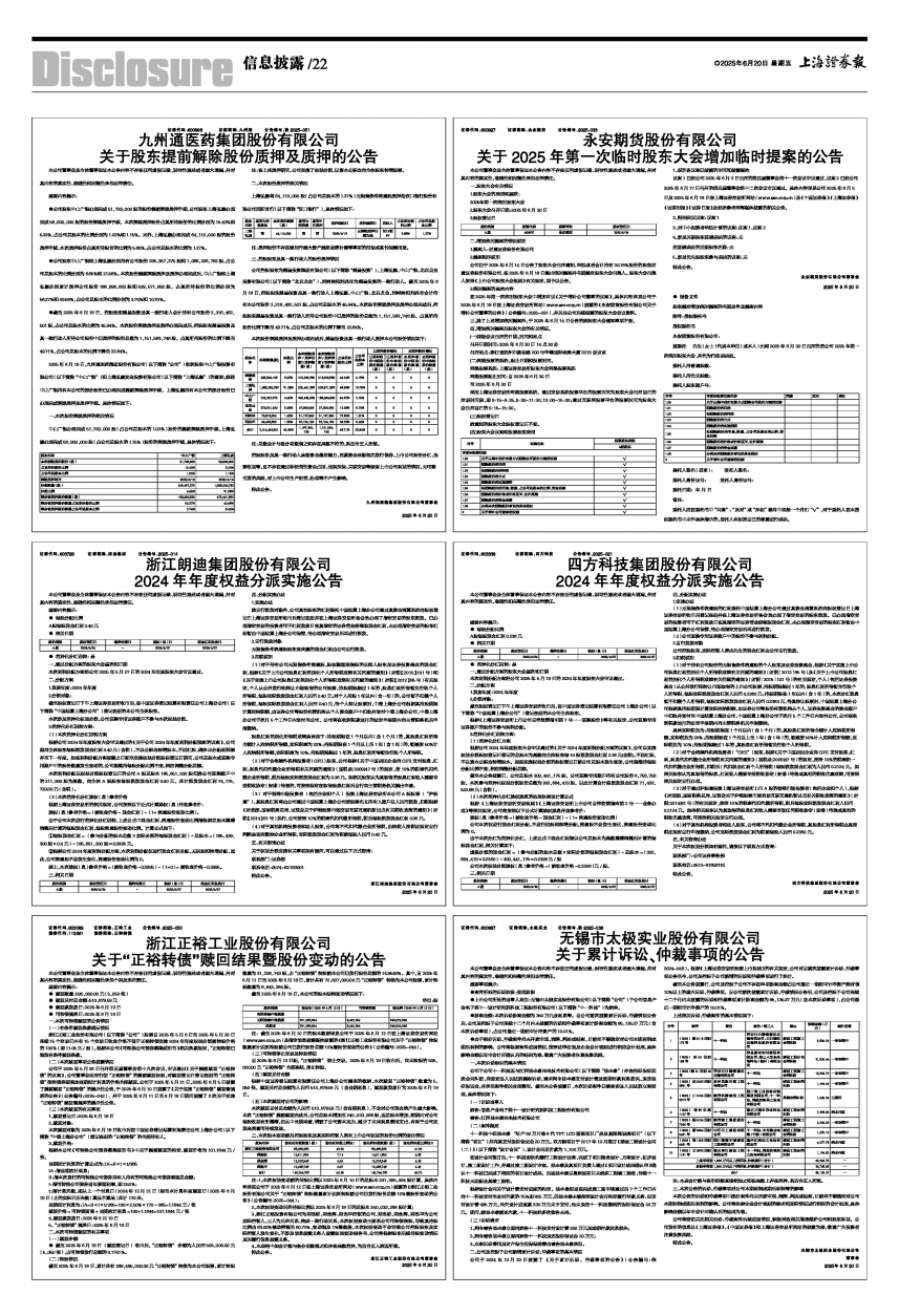 截至2025年6月18日,累计共有289,495,000.00元“正裕转债”转换为本公司股票,累计转股数量为31,226,743股,占“正裕转债”转股前本公司已发行股份总额的14.9549%。其中,自2025年6月11日至2025年6月18日,累计共有72,607,000.00元“正裕转债” 转换为本公司股票,累计转股数量为8,643,264股。
