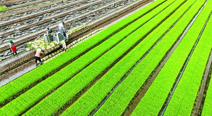 6月19日,在江苏省连云港市东海县张湾乡张湾村秧板田里,农民起水稻秧苗准备进行机插作业。夏至将近,人们把握农时、辛勤耕作,期待收获。 新华社图