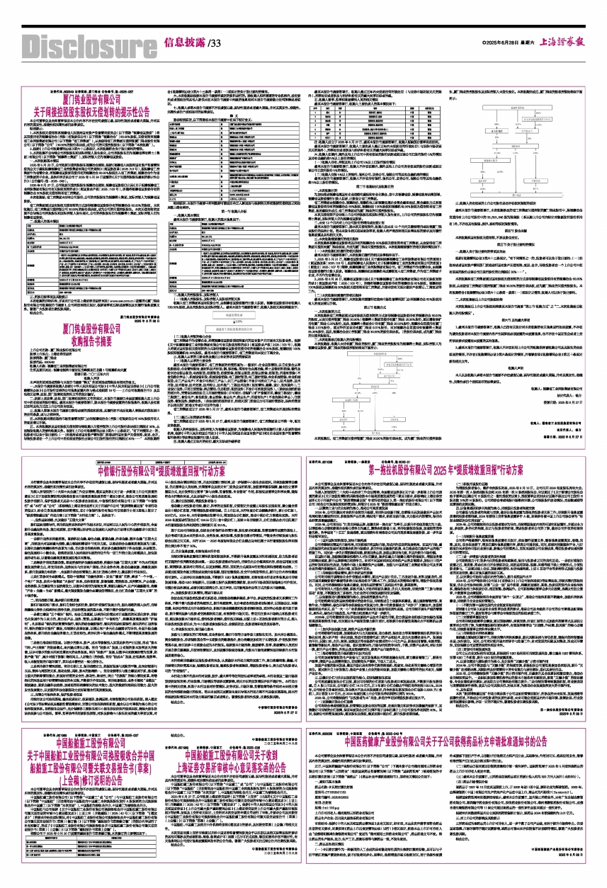 2025年6月27日,公司收到上海证券交易所(以下简称“上交所”)出具的《关于中国船舶工业股份有限公司换股吸收合并中国船舶重工股份有限公司暨关联交易的审核中心意见落实函》(上证上审(并购重组)〔2025〕42号)(以下简称“《落实函》”)。根据《中华人民共和国公司法》《中华人民共和国证券法》《上市公司重大资产重组管理办法》《上海证券交易所上市公司重大资产重组审核规则》等法律、法规及上交所有关规定,上交所对本次交易的申请文件进行了审核,并要求公司及时提交《中国船舶工业股份有限公司换股吸收合并中国船舶重工股份有限公司暨关联交易报告书(草案)(上会稿)》(以下简称“草案(上会稿)”)。