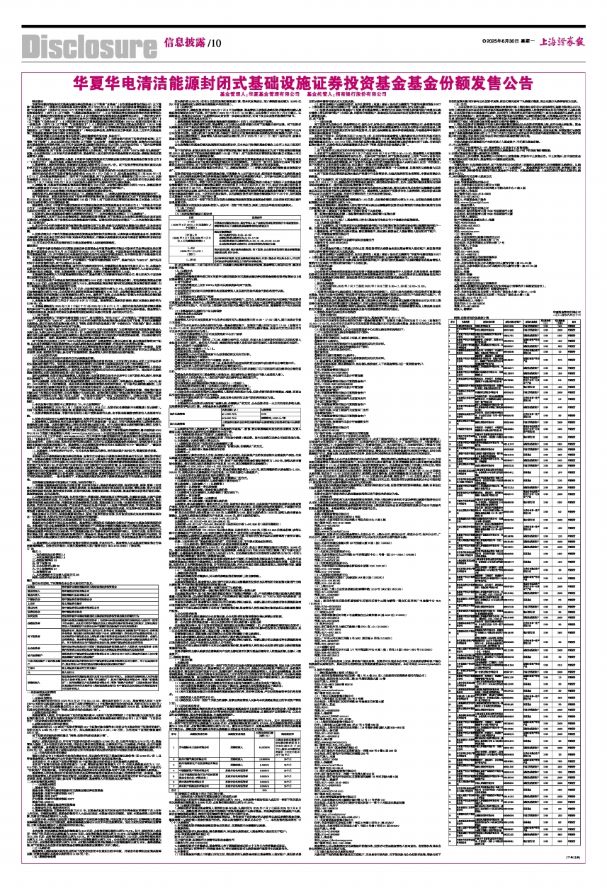 10、本公告仅对本基金发售的有关事项和规定予以说明。投资者欲了解本基金的详细情况,请仔细阅读2025年6月24日登载于基金管理人网站(www.ChinaAMC.com)、中国证监会基金电子披露网站(http://eid.csrc.gov.cn/fund)及上交所网站(www.sse.com.cn)的《华夏华电清洁能源封闭式基础设施证券投资基金基金合同》(“《基金合同》”)、《华夏华电清洁能源封闭式基础设施证券投资基金招募说明书》(“《招募说明书》”)等相关法律文件。投资有风险,投资者在进行投资决策前,应充分认识基础设施基金的风险特征,普通投资者在首次购买本基金时须签署风险揭示书。基金管理人在此提请投资者特别关注《招募说明书》中“重要提示”、“重要风险提示”和“风险揭示”章节,充分了解基金的各项风险因素。