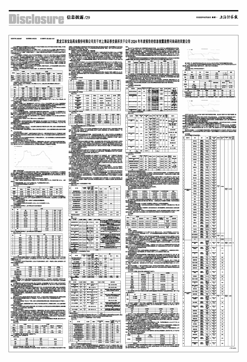 黑龙江珍宝岛药业股份有限公司(以下简称“公司”)于2025年6月3日收到上海证券交易所下发的《关于黑龙江珍宝岛药业股份有限公司2024年年度报告的信息披露监管问询函》(上证公函【2025】0715号,以下简称“《监管问询函》”),根据上海证券交易所的规定,公司现将《监管问询函》中的问题回复如下:
