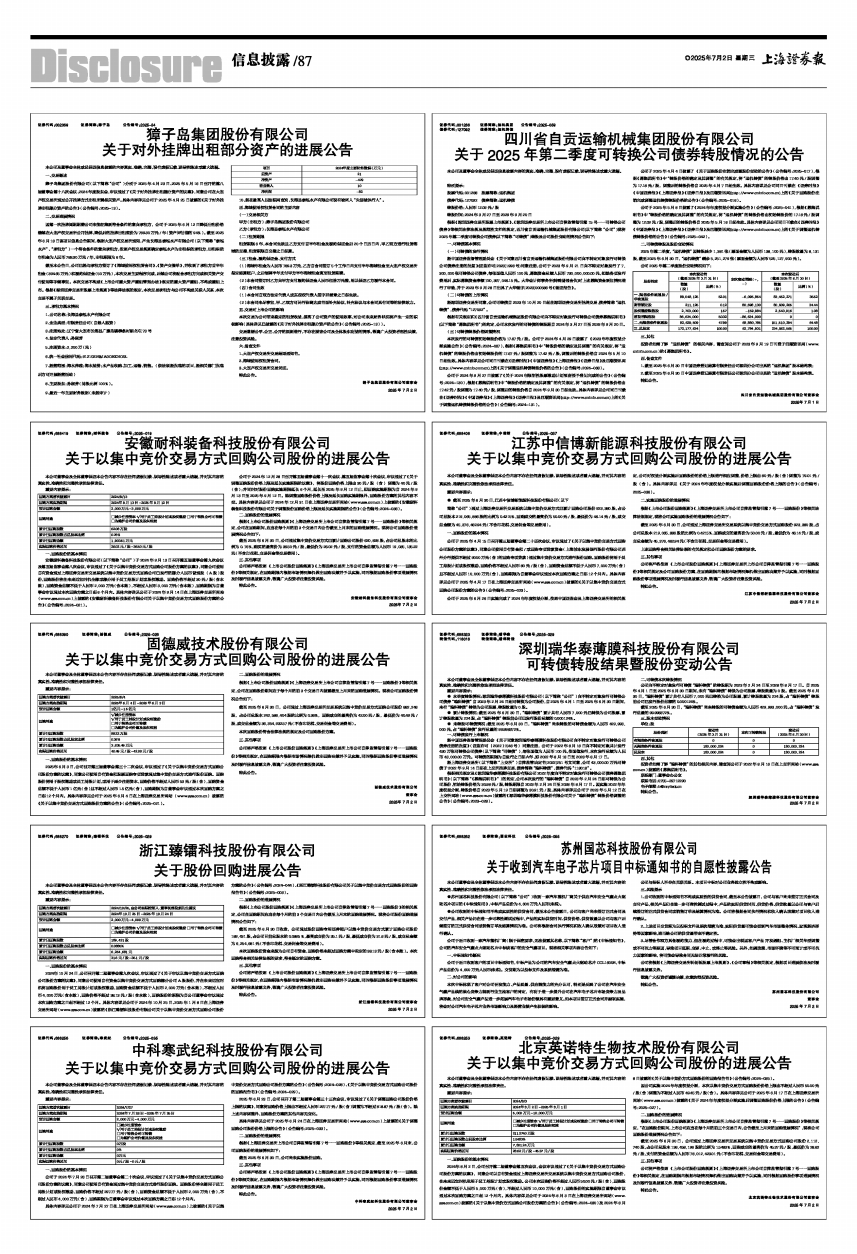 关于2025年第二季度可转换公司债券转股情况的公告 -