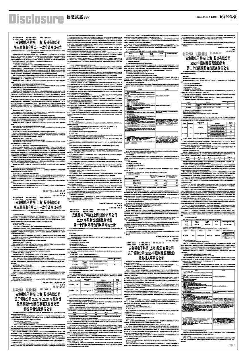 安集微电子科技(上海)股份有限公司(以下简称“公司”)于2025年7月1日召开了第三届董事会第二十一次会议及第三届监事会第二十一次会议,审议通过了《关于调整公司2023年、2024年限制性股票激励计划相关事项的议案》《关于作废处理部分限制性股票的议案》。现将有关事项说明如下: