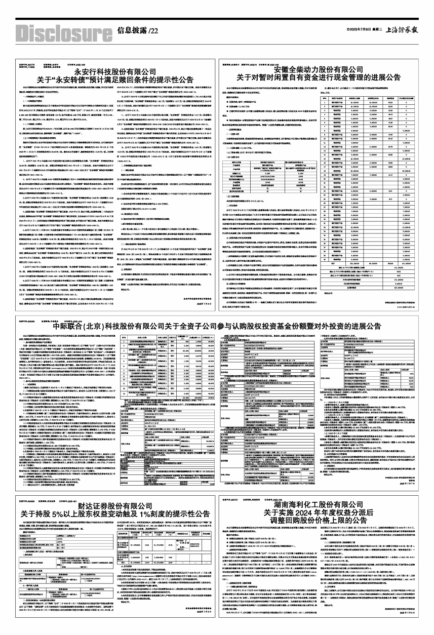 为进一步拓宽公司投资渠道,中际联合(北京)科技股份有限公司(以下简称“公司”)全资子公司中际联合(北京)装备制造有限公司(以下简称“中际装备”)与北京明势私募基金管理有限公司(以下简称“北京明势”)等合作方签署了《成都自知联锦创业投资合伙企业(有限合伙)合伙协议》(以下简称“合伙协议”),中际装备作为有限合伙人以自有资金认缴出资2,000万元人民币。成都自知联锦创业投资合伙企业(有限合伙)(以下简称“自知联锦”)已于2024年8月20日在中国证券投资基金业协会完成备案,备案编码:SANF44。自知联锦的基金管理人、执行事务合伙人(普通合伙人)为北京明势。本次对外投资事项不构成同业竞争,不构成关联交易,也不构成《上市公司重大资产重组管理办法》规定的重大资产重组。具体内容详见公司于2024年4月17日、2024年8月22日在上海证券交易所网站(www.sse.com.cn)及指定信息披露媒体披露的《中际联合(北京)科技股份有限公司关于全资子公司参与认购股权投资基金份额暨对外投资的公告》(公告编号:2024-024)、《中际联合(北京)科技股份有限公司关于全资子公司参与认购股权投资基金份额暨对外投资的进展公告》(公告编号:2024-047)。