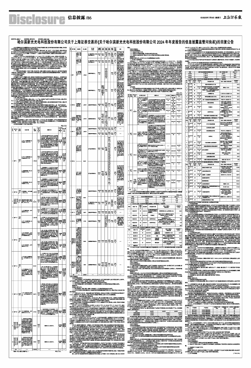 哈尔滨新光光电科技股份有限公司(以下简称“新光光电”或“公司”)于近日收到上海证券交易所下发的《关于哈尔滨新光光电科技股份有限公司2024年年度报告的信息披露监管问询函》(上证科创公函【2025】0232号,以下简称“《问询函》”)。根据《问询函》的要求,现就有关情况回复公告如下: