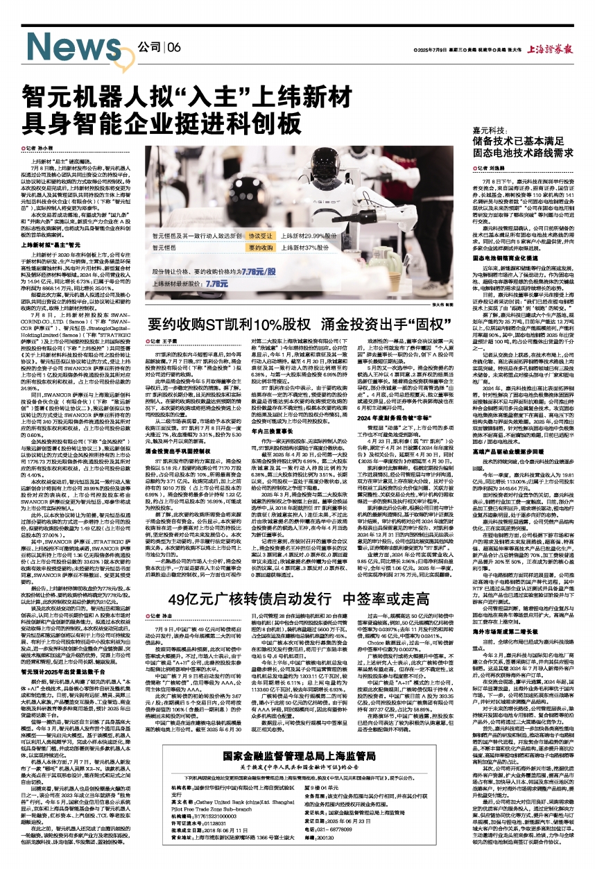 7月8日,上纬新材控股股东SWANCORIND.CO.,LTD.(Samoa)(下称“SWANCOR萨摩亚”)、智元恒岳、StrategicCapitalHoldingLimited(Samoa)(下称“STRATEGIC萨摩亚”)及上市公司间接控股股东上纬国际投资控股股份有限公司(下称“上纬投控”)共同签署《关于上纬新材料科技股份有限公司之股份转让协议》。智元恒岳拟以协议转让的方式,受让上纬投控的全资子公司SWANCOR萨摩亚所持有的上市公司1亿股无限售条件流通股份及其所对应的所有股东权利和权益,占上市公司股份总数的24.99%。