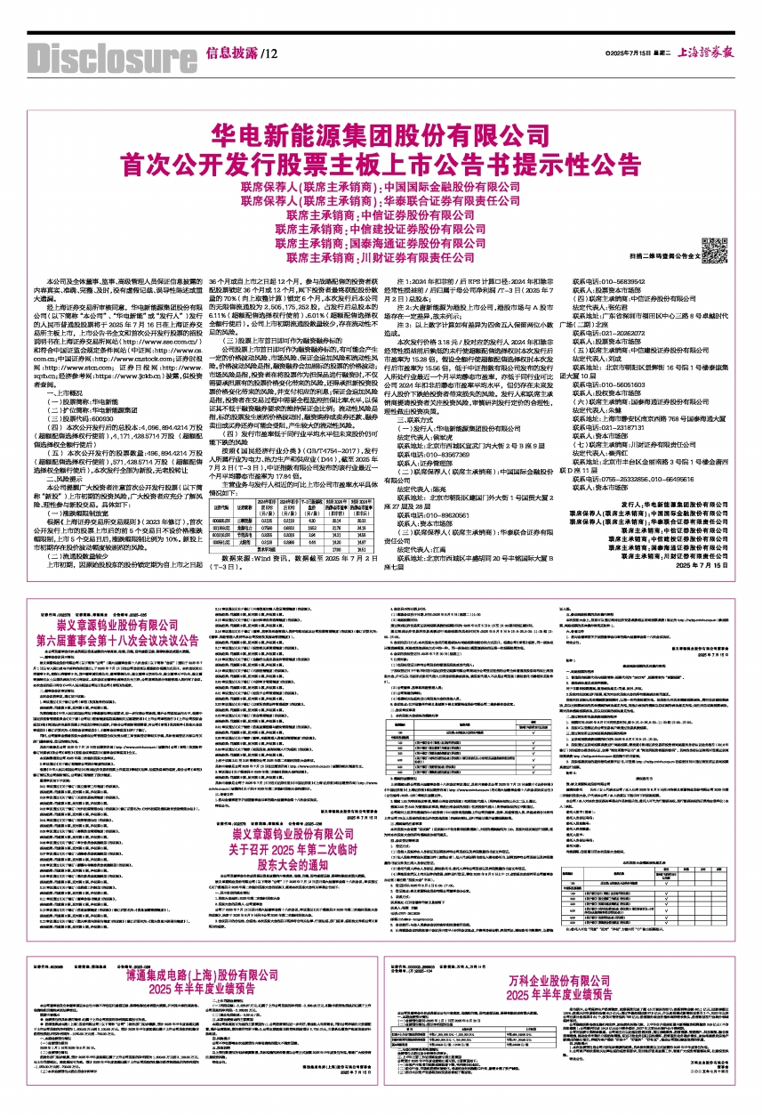 经上海证券交易所审核同意,华电新能源集团股份有限公司(以下简称“本公司”、“华电新能”或“发行人”)发行的人民币普通股股票将于2025年7月16日在上海证券交易所主板上市,上市公告书全文和首次公开发行股票的招股说明书在上海证券交易所网站(http://www.sse.com.cn/)和符合中国证监会规定条件网站(中证网:http://www.cs.com.cn;中国证券网:http://www.cnstock.com;证券时报网:http://www.stcn.com;证券日报网:http://www.zqrb.cn;经济参考网:https://www.jjckb.cn)披露,供投资者查阅。