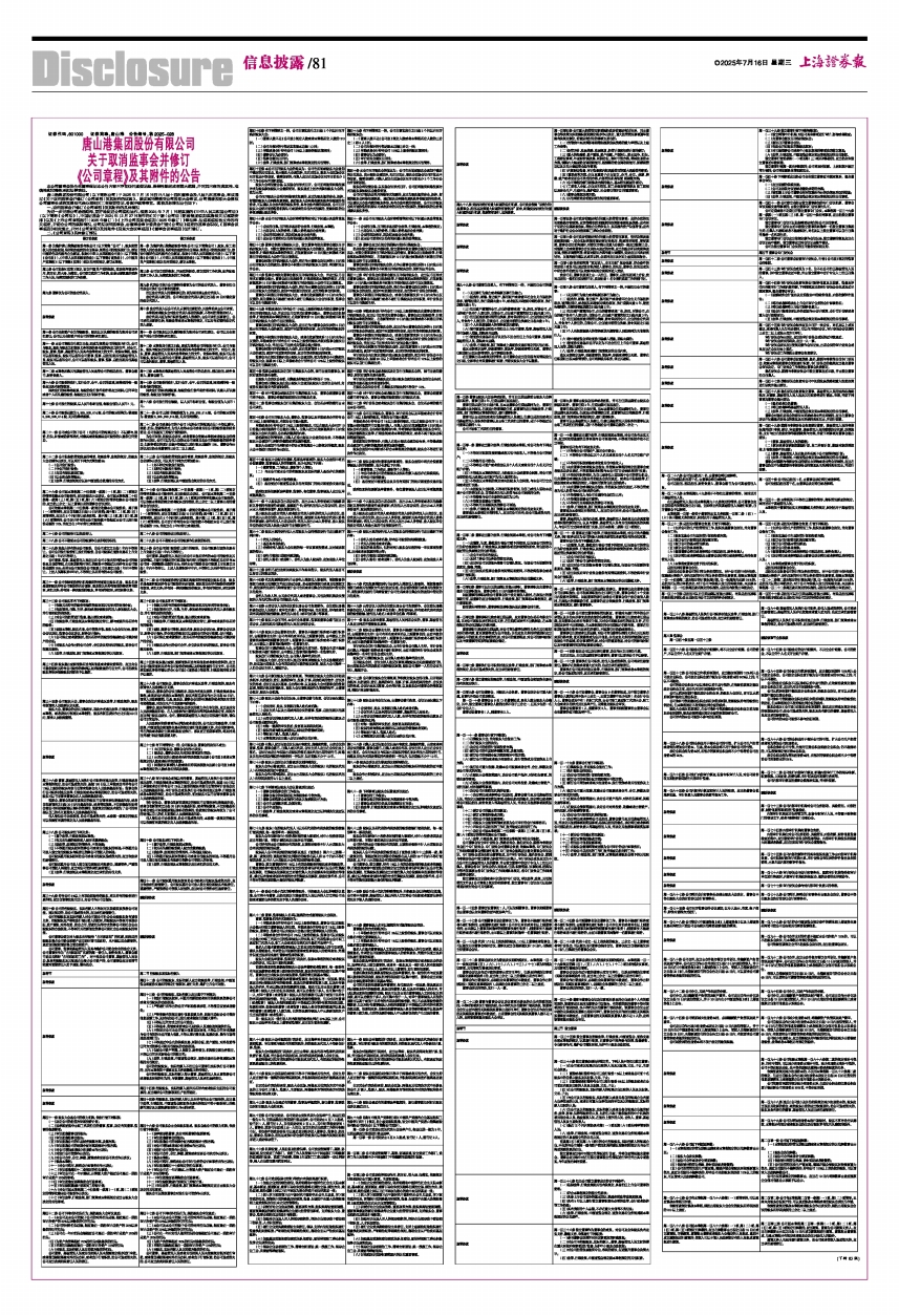 唐山港集团股份有限公司(以下简称公司)于2025年7月15日召开八届十四次董事会及八届九次监事会,审议通过《关于取消监事会并修订〈公司章程〉及其附件的议案》。该议案尚需提交公司股东大会审议,公司提请股东大会授权公司董事长或者其授权代表办理相关工商变更登记、备案手续等事宜。现将具体情况公告如下: