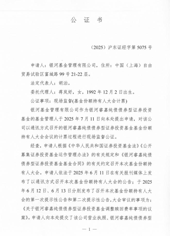 银河基金管理有限公司(以下简称“基金管理人”或“本公司”)以通讯方式组织召开了银河睿嘉纯债债券型证券投资基金基金份额持有人大会,会议投票时间自2025年6月14日起,至2025年7月14日17:00 止(投票表决时间以基金管理人收到表决票时间为准)。会议审议了《关于银河睿嘉纯债债券型证券投资基金调整赎回费率事项的议案》(以下简称“本次会议议案”)。