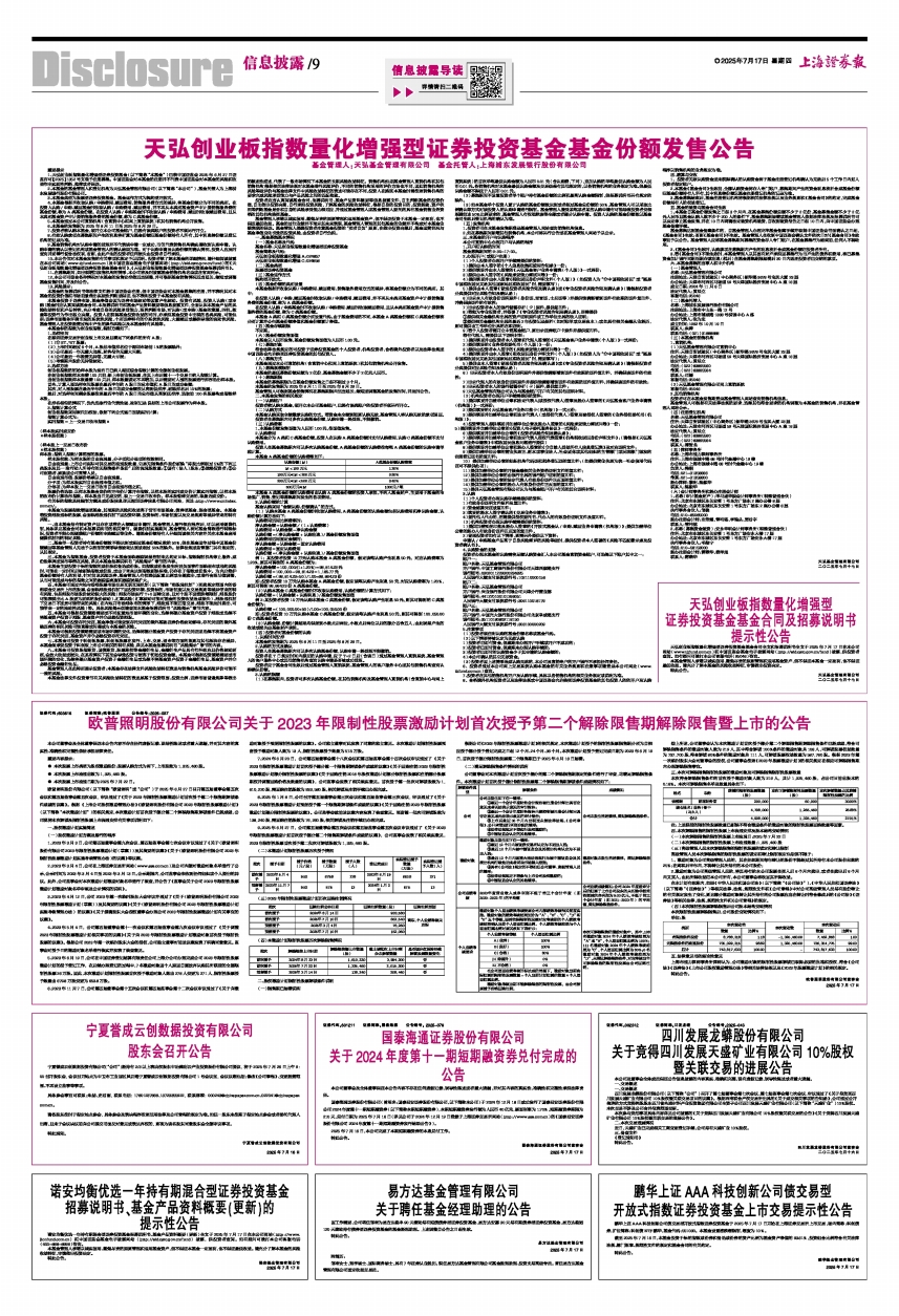 天弘创业板指数量化增强型证券投资基金基金合同全文和招募说明书全文于2025年7月17日在本公司网站(www.thfund.com.cn)和中国证监会基金电子披露网站(http://eid.csrc.gov.cn/fund)披露,供投资者查阅。如有疑问可拨打本公司客服电话(95046)咨询。