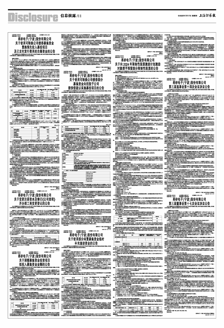 ● 2025年7月15日,甬矽电子(宁波)股份有限公司(以下简称“公司”)召开第三届董事会第十七次会议和第三届监事会第十四次会议,审议通过了《关于使用可转换公司债券募集资金置换预先投入募投项目及已支付发行费用的自筹资金的议案》,同意公司使用募集资金置换预先已投入募投项目的自筹资金及已支付发行费用的自筹资金,置换资金总额为人民币19,245.99万元(不含税)。