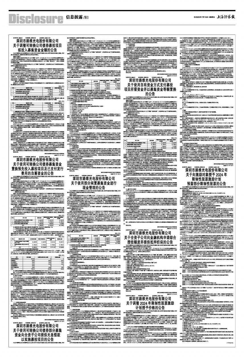 深圳市路维光电股份有限公司(以下简称“公司”)于2025年7月17日召开第五届董事会第十八次会议、第五届监事会第十八次会议,审议通过了《关于调整可转换公司债券募投项目拟投入募集资金金额的议案》,同意公司根据实际情况对募集资金投资项目(以下简称“募投项目”)拟投入募集资金金额进行调整。