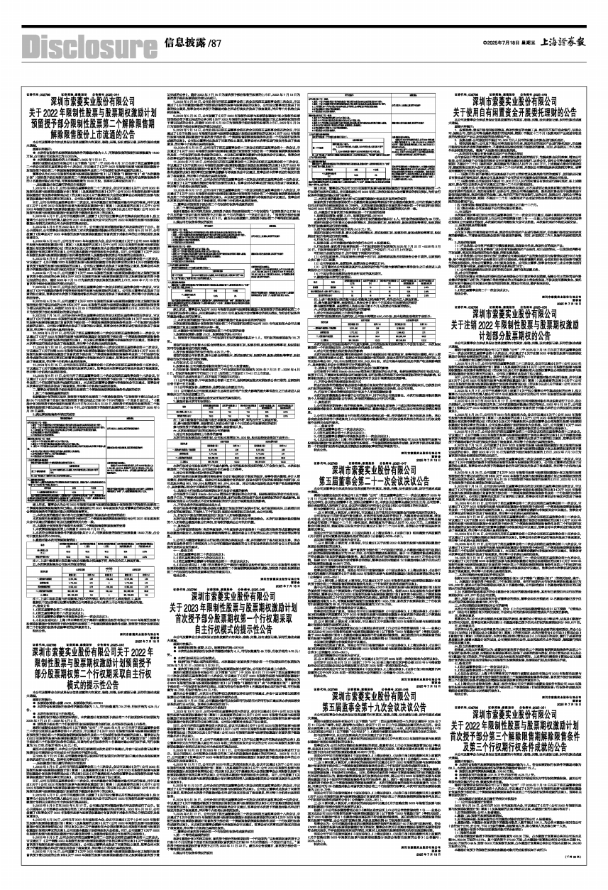 详见公司于同日在指定媒体《中国证券报》、《上海证券报》、《证券日报》和巨潮资讯网上披露的《关于2022年限制性股票与股票期权激励计划首次授予部分第三个解除限售期解除限售条件及第三个行权期行权条件成就的公告》(公告编号:2025-051)。