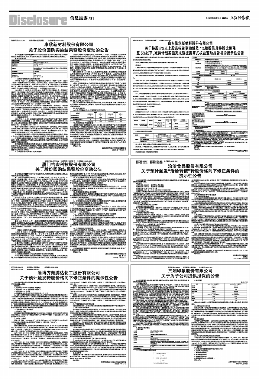 5、根据《洽洽食品股份有限公司公开发行可转换公司债券募集说明书》(以下简称“《募集说明书》”)的规定,在本次发行的可转换公司债券(以下简称“可转债”)存续期间,当洽洽食品股份有限公司(以下简称“公司”)股票在任意连续三十个交易日中至少有十五个交易日的收盘价低于当期转股价格的85%时,公司董事会有权提出转股价格向下修正方案并提交公司股东大会审议表决。本次触发转股价格向下修正条件的期间自2025年7月7日起算,截至2025年7月18日,公司股票已有十个交易日的收盘价低于“洽洽转债”当期转股价格的85%(即47.54元/股)的情形,预计将触发“洽洽转债”转股价格向下修正条件。